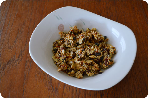 to be honest, i didn’t think i cared much about granola. certainly not enough to develop a recipe for it, but i was thinking about it one day, and then looked up paleomg’s granola, and tried it. it’s pretty good, and definitely got me to the point where i knew i could modify it to be just my style. i decided to try processing all the larger nuts into a uniform crumble to mix with soaked flax and chia seeds, and then incorporate the smaller nuts and seeds as their own texture. though it dehydrates for a long time, it totally worked, i got clusters that don’t fall apart in milk and a texture that feels like the granola i like. now i have to actually measure it so i can post it.