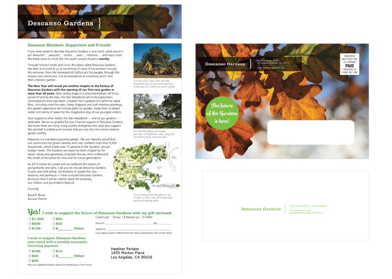 We created this showcase letter with a run-down of innovative projects completed with a forecast of what’s to come next year, all delivered in a very colorful mailing envelope themed by the oaks Descanso is known for. This piece got a lot done in a small space, and they reported an increase in returns from previous years.