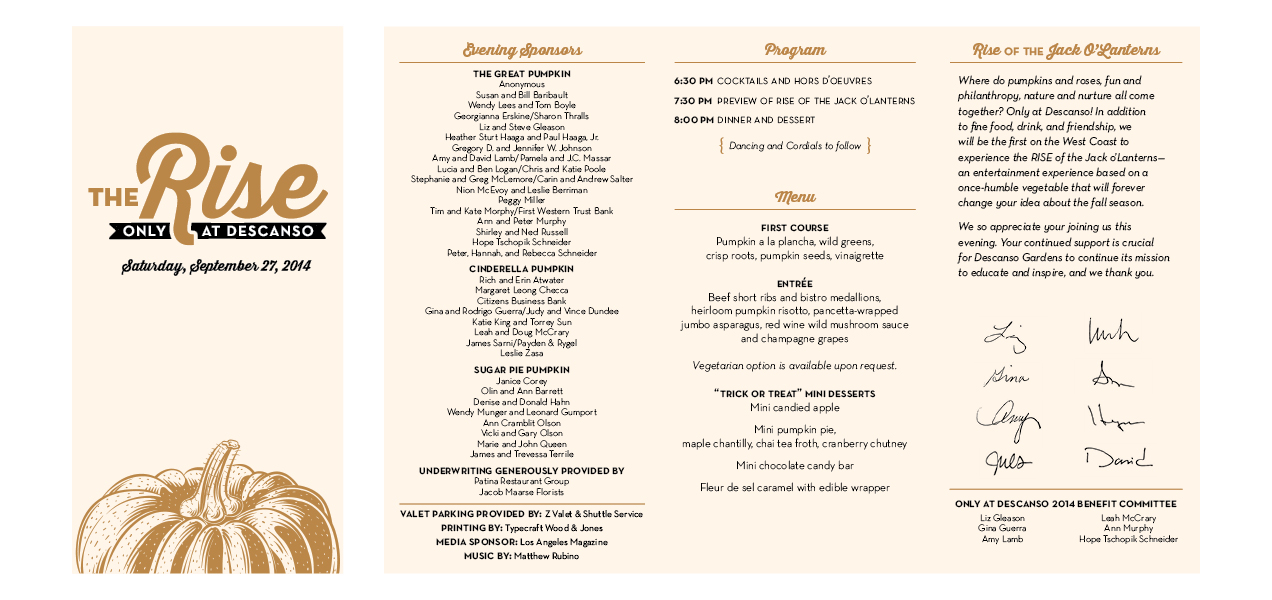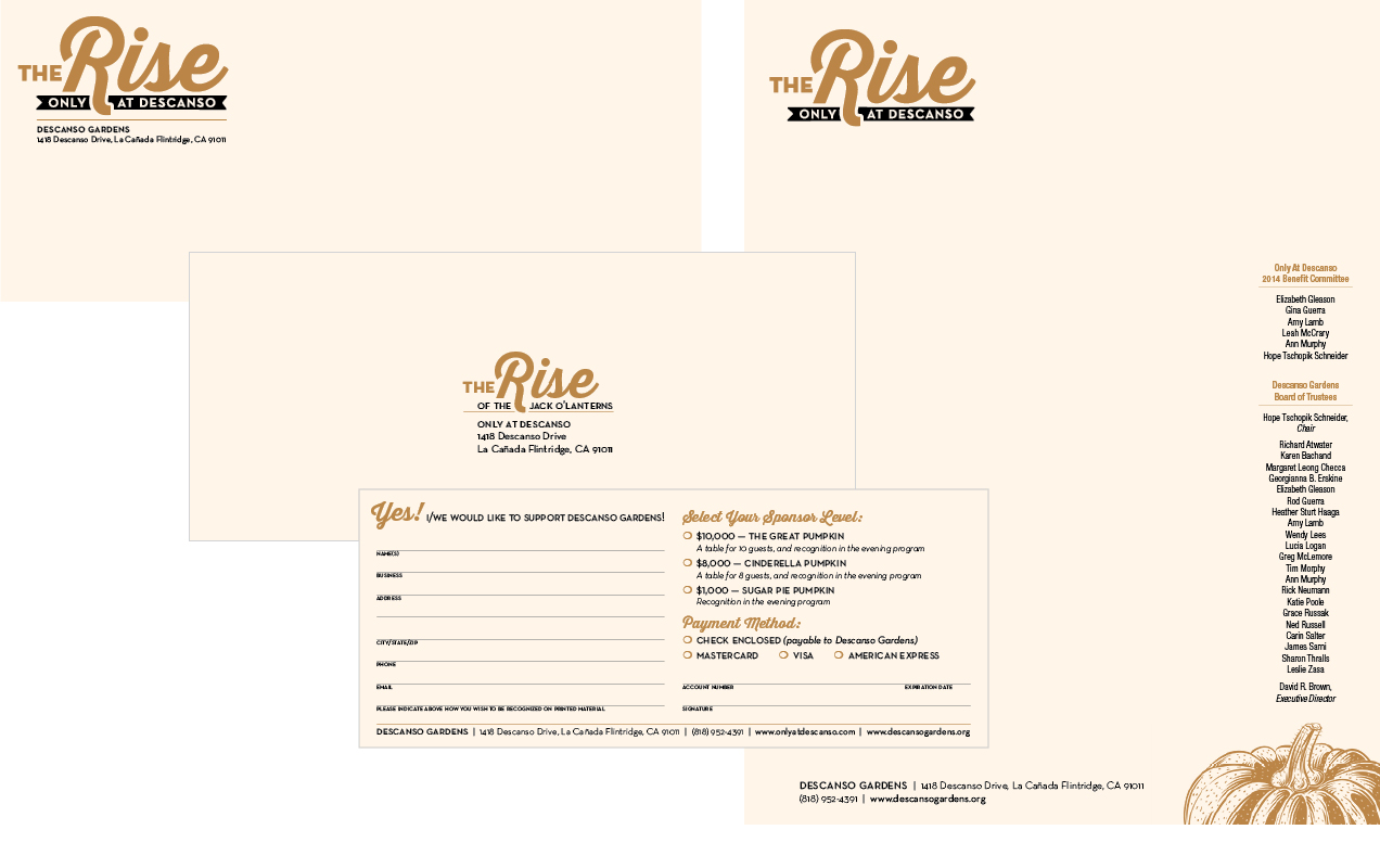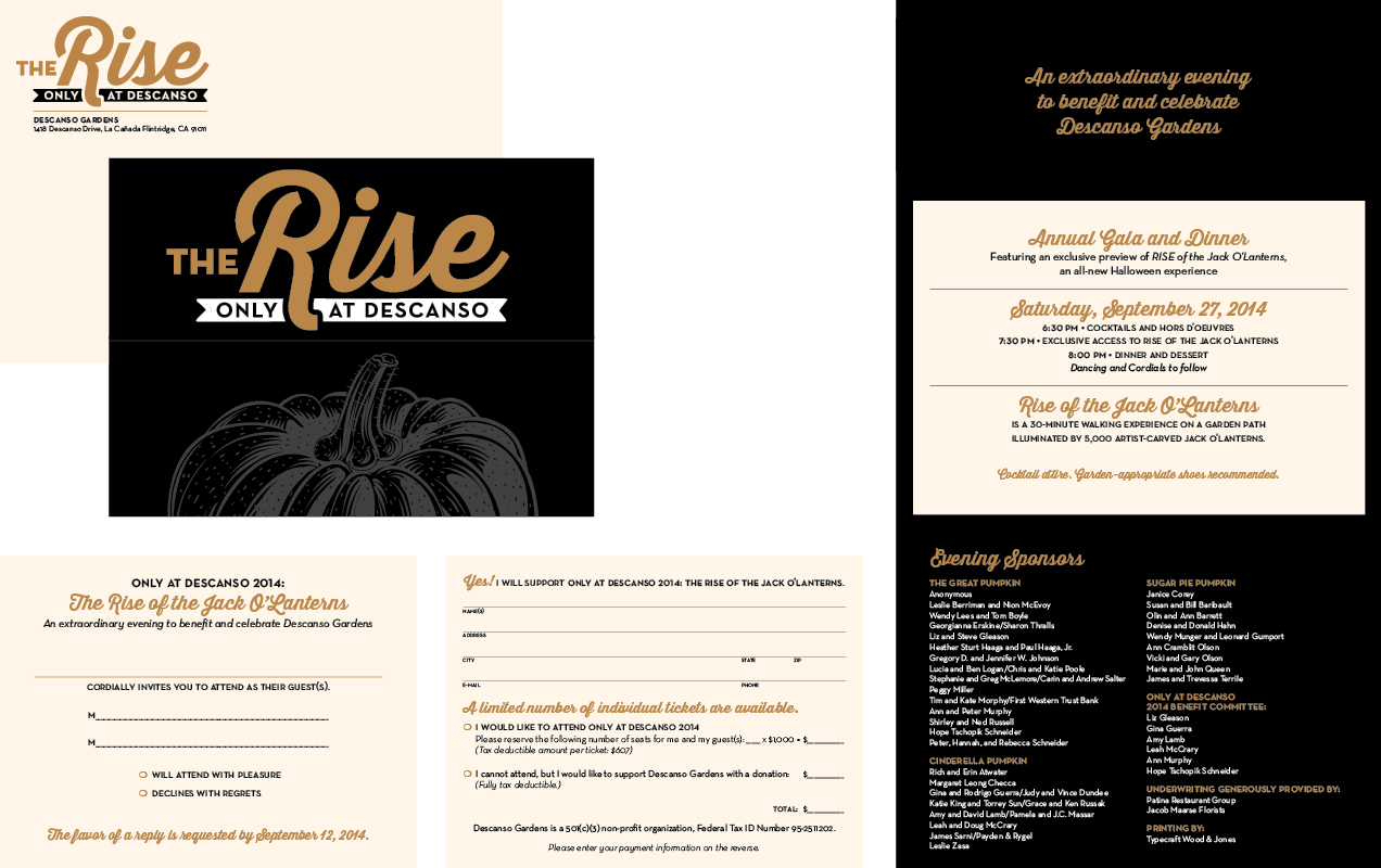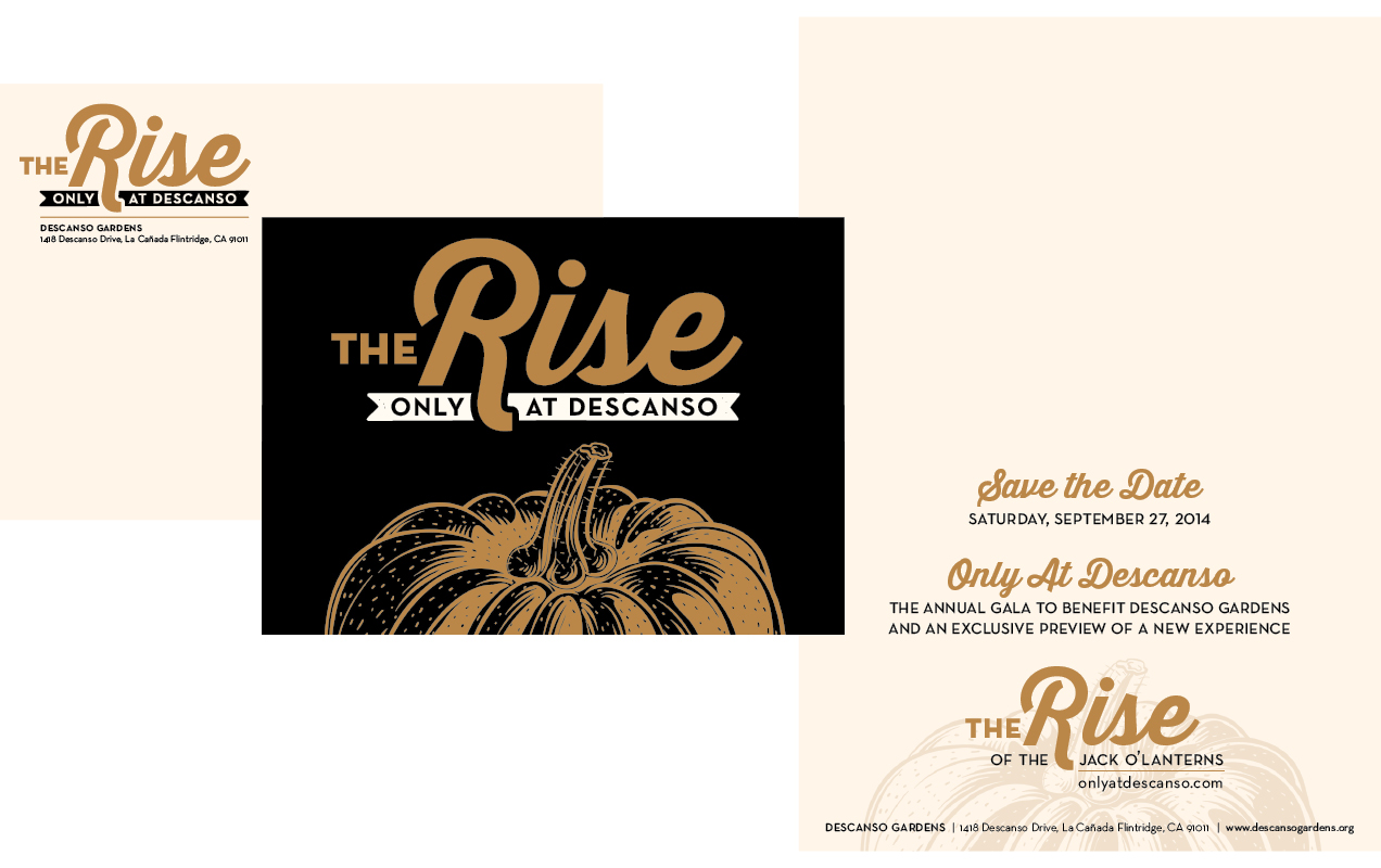 Letterhead, commitment form, save-the-date set, complete event invite and on-site collateral for annual fundraiser gala. As the only west coast host to The Rise of the Jack O’Lanterns, Descanso set their fundraising gala ahead of the public event as an evening garden cocktail party among candle-lit carved pumpkin sculptures. I decided to glam it up by printing metallic copper on cream paper, printing in 2-color with strategic paper layering, adding an elegant twist to the fall festivities. Descanso reported this event to be highly successful in both experience and fundraising efforts.