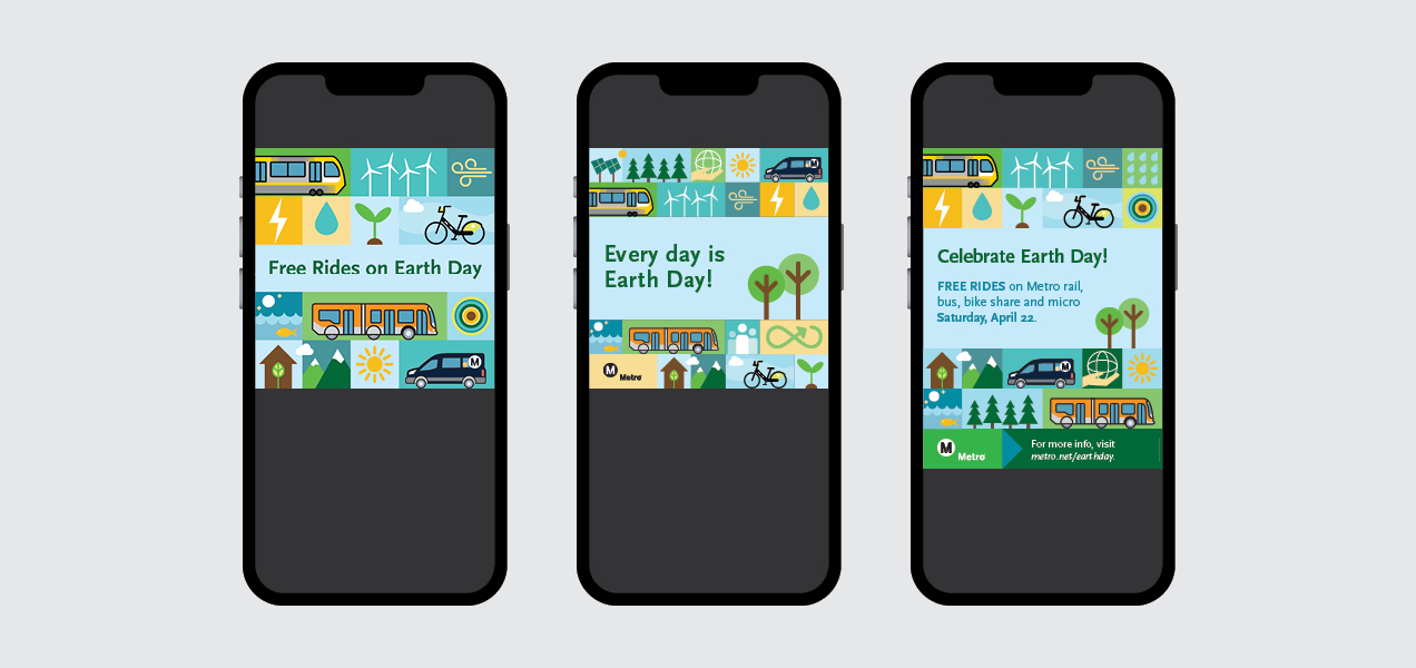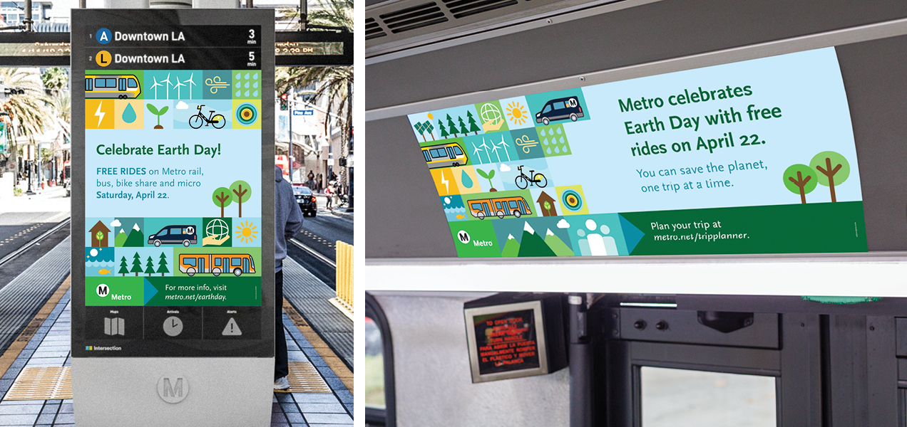 For Metro’s 2023 Earth Day celebration, I created this colorful, modular vector illustration design to work itself into bus and rail posters, customer info digital screens in stations and on platforms, a commemorative TAP card, hand-out stickers and a full social media campaign to engage with riders and help nudge those trying the LA Metro transit system for the first time.