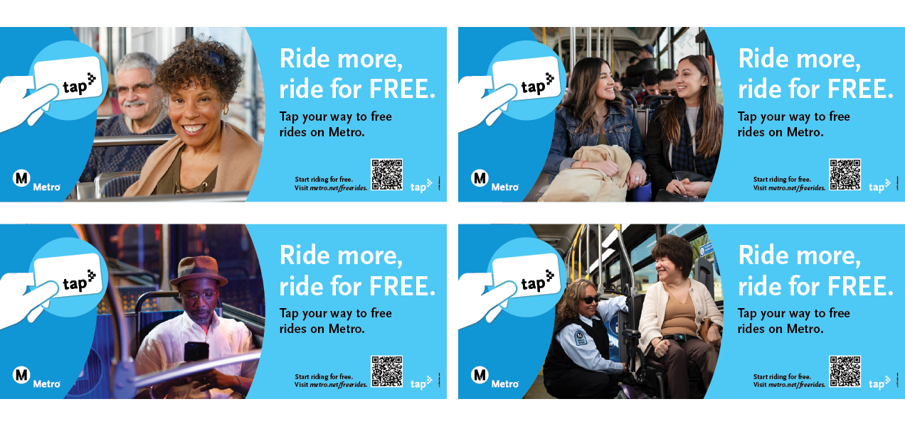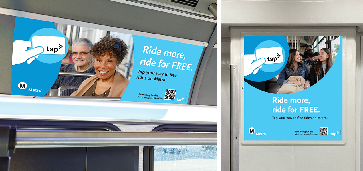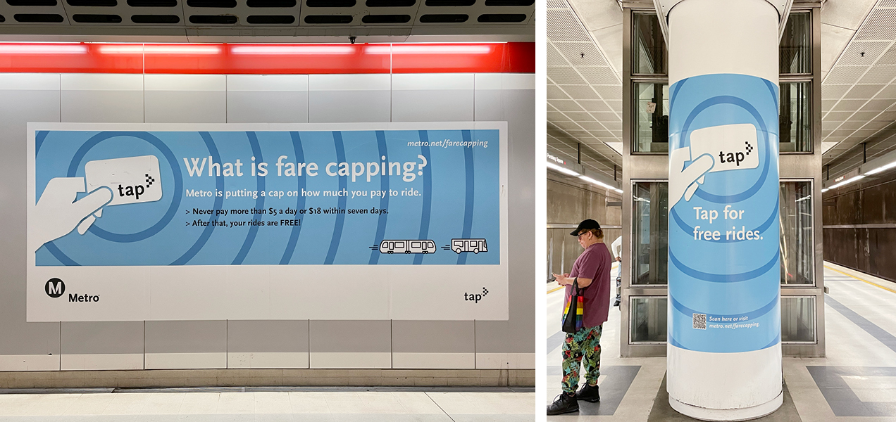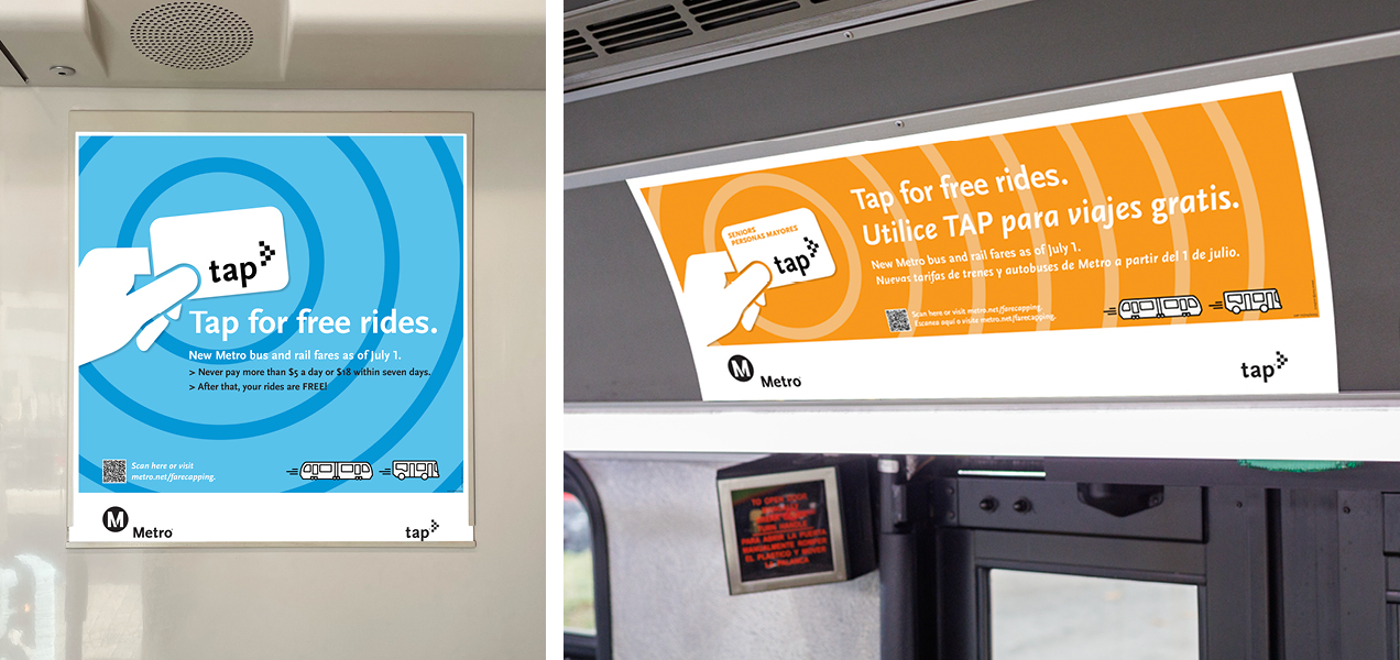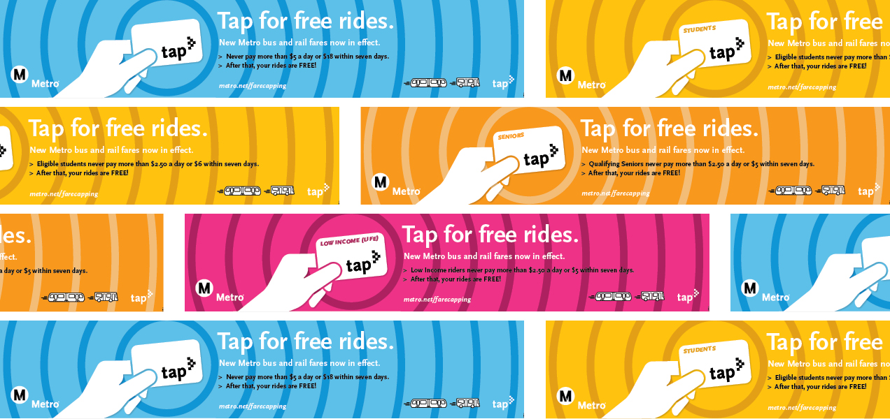 In an effort to reduce fares for frequent riders of all types, Metro made major changes to the discounts riders can get with a TAP card. We started with a conversion campaign, raising awareness among cash riders about the benefits of using a TAP card to earn discounts, and followed through by introducing fare capping in a splashy, color-coded campaign with different messages addressed to each rider type. This extended to bus and rail posters, interactive digital displays, throughout social media, and used all available ad spaces on Union Station, Civic Center and Pershing Square mezzanines and platforms in full station dominations. Over the duration of the active campaign, Metro saw an increase in ridership of 12% with riders earning 5% of their rides for free! This campaign was covered in TimeOut Los Angeles, Mass Transit Magazine and Governing.com.