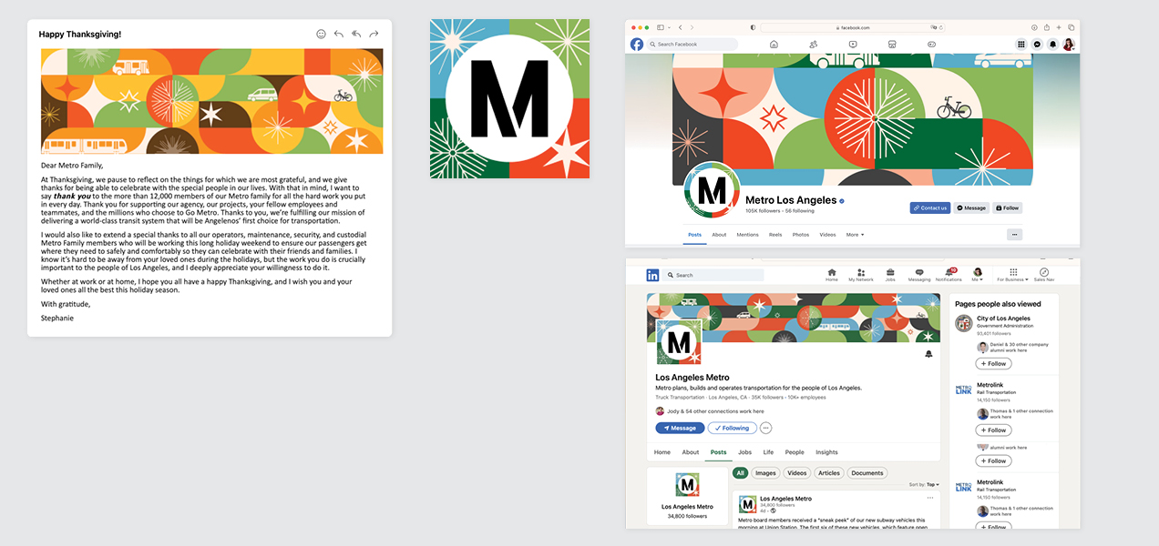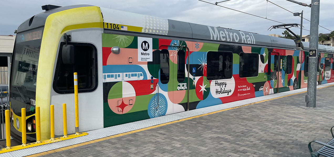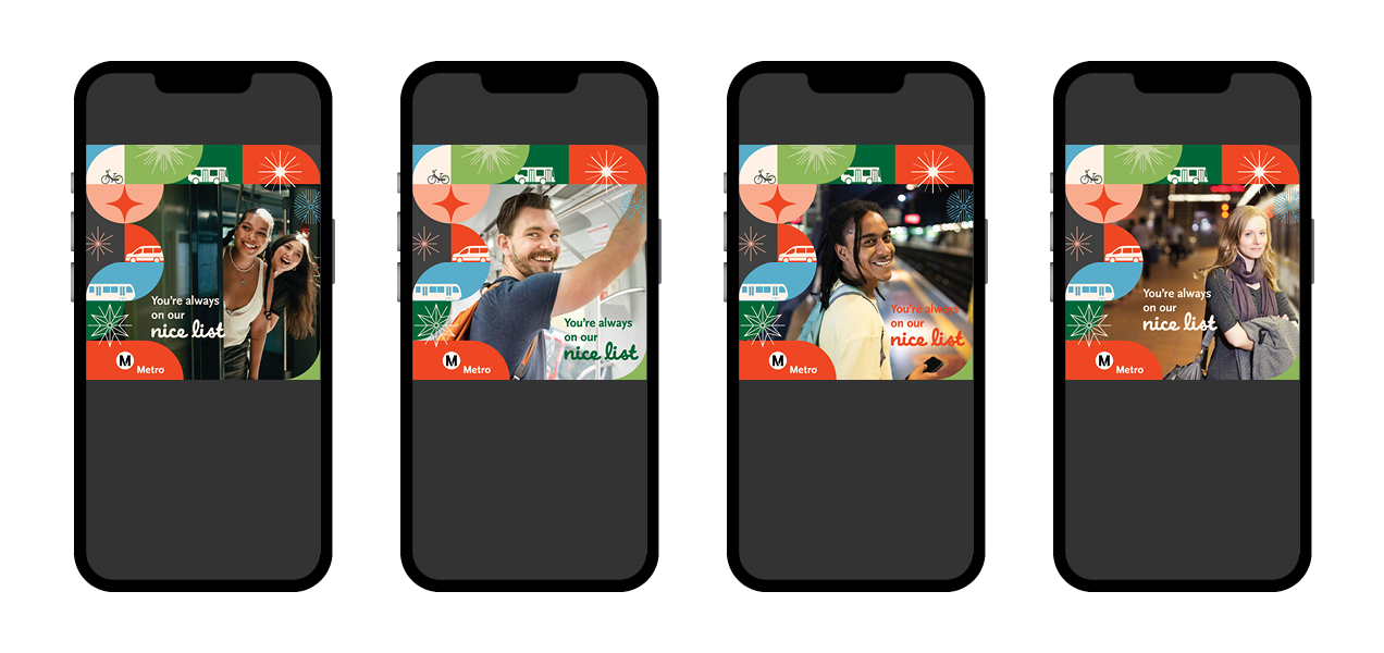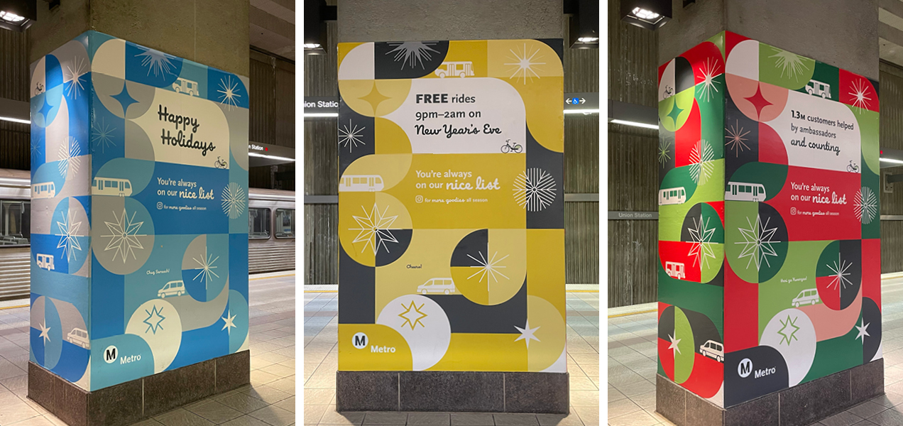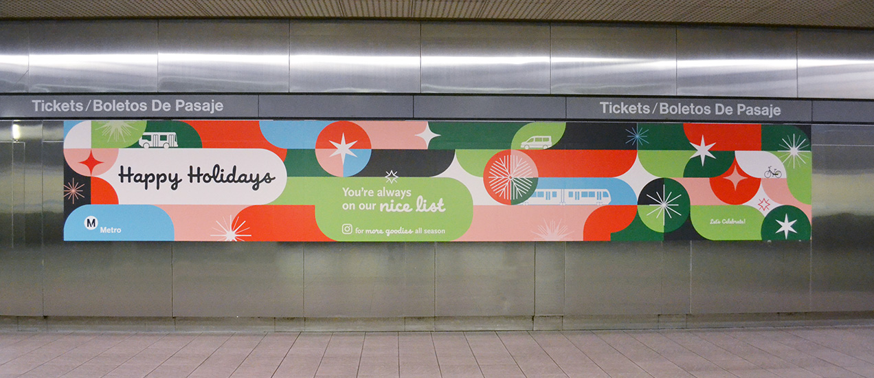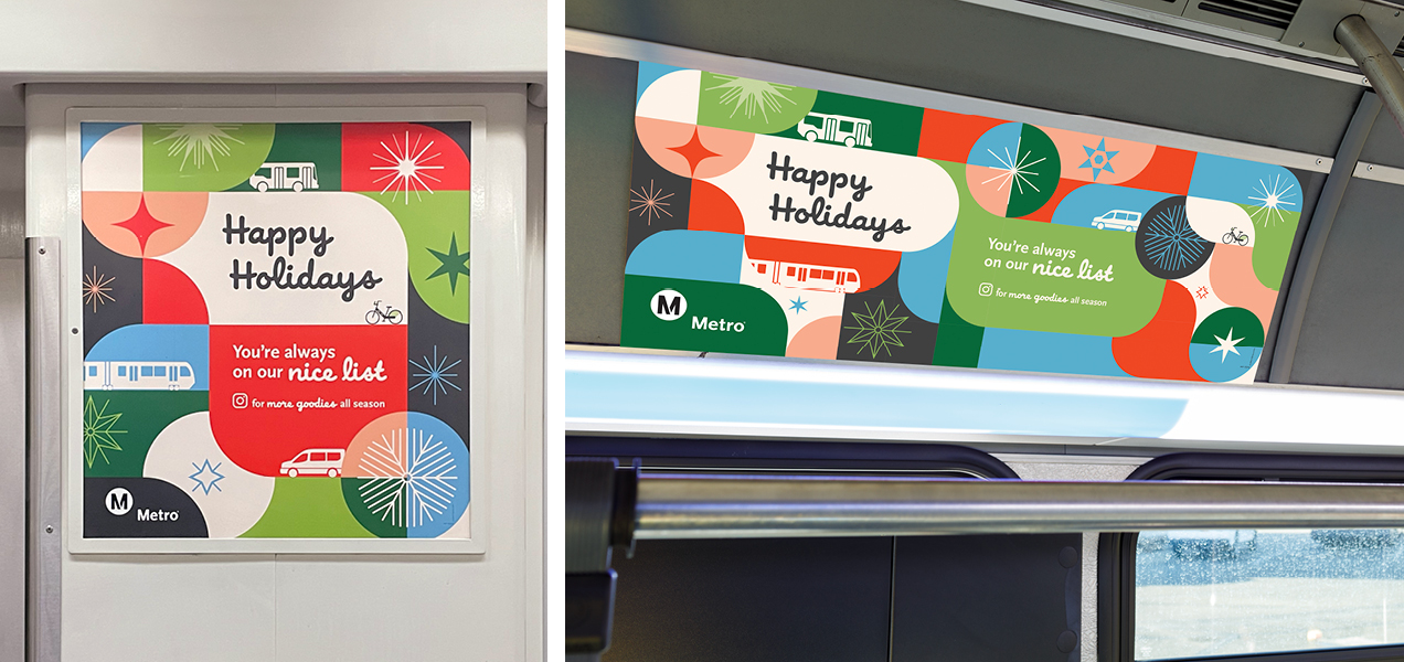 Bringing the holiday cheer for Metro’s 2024 Holiday Campaign, I created this colorful, inclusive, versatile shape system, driving affinity for Metro services and enticing riders to follow along on Instagram for surprise & delight giveaways and special events. This campaign spanned the on-board system as a full station domination on the Union Station B/D Line mezzanine and platform, rail posters, bus car cards, bus & train wraps, large format station decals, Metro Shop merch, digital, social and motion graphics, OOH and environmental graphics. This affinity campaign was active from mid-November 2024 through February 2025.