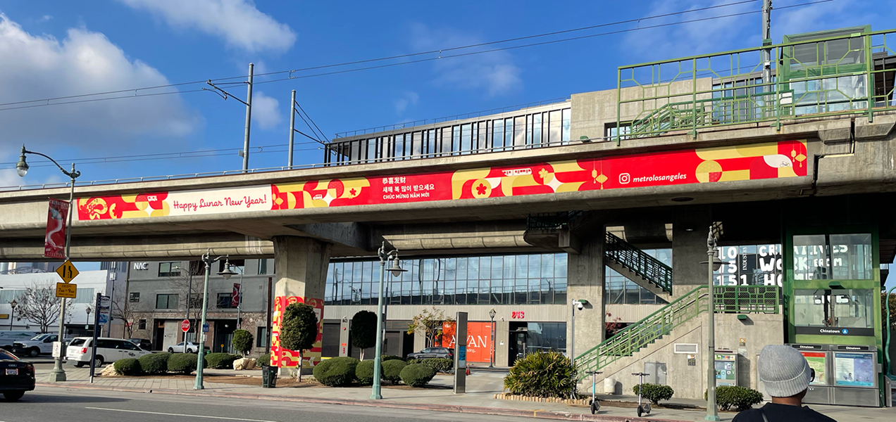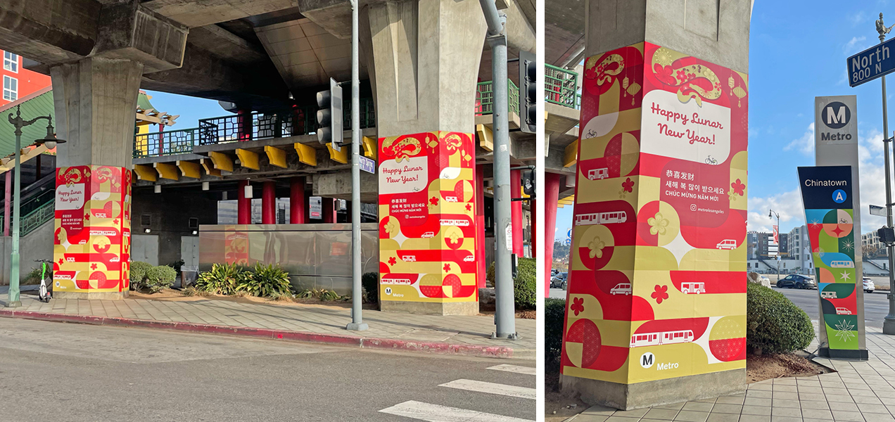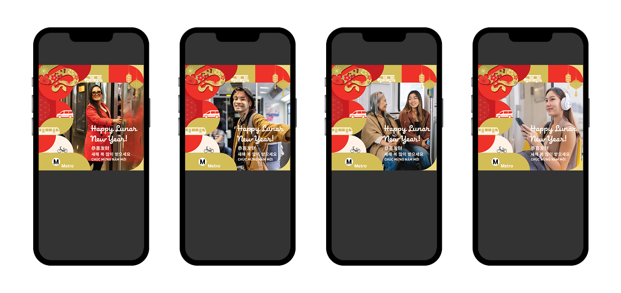 For the ’24-’25 Holiday Season, Metro launched back-to-back affinity campaigns moving from the winter holidays into Lunar New Year. 2025 is the Year of the Snake, showcasing festive art encompassing rail posters, bus car cards, bus wraps, train wraps, systemwide animated digital information panels, social media, station 2-sheets, a commemorative TAP card and a full OOH domination at Chinatown Station. As this campaign is a phase 2 of the Metro Holiday 2024 Campaign, it follows the same look with a Lunar New Year theme, approved by the Metro Chinese ERG providing cultural feedback and guidance.
