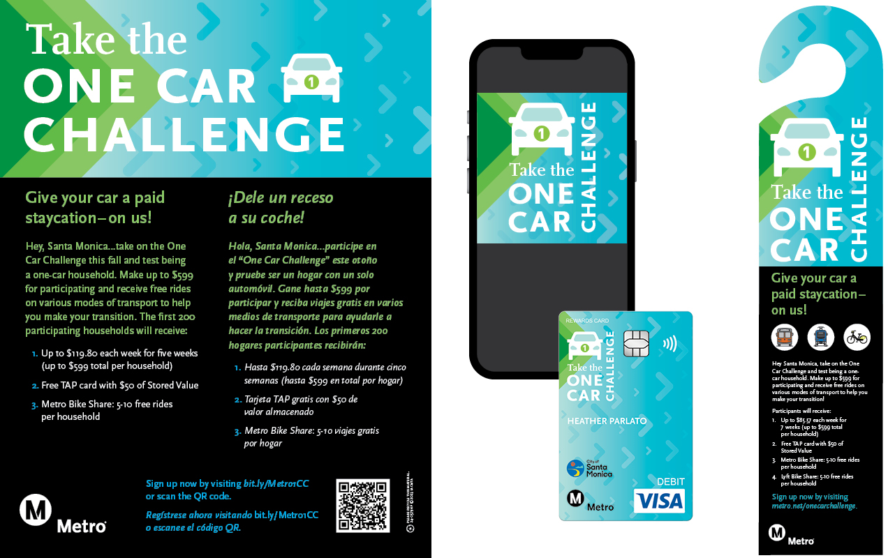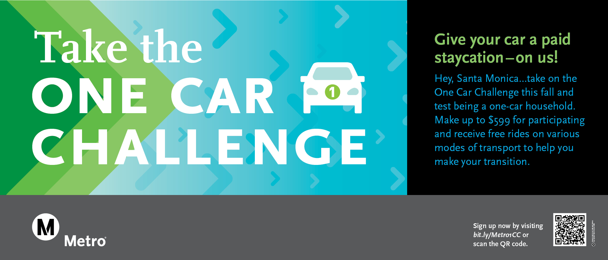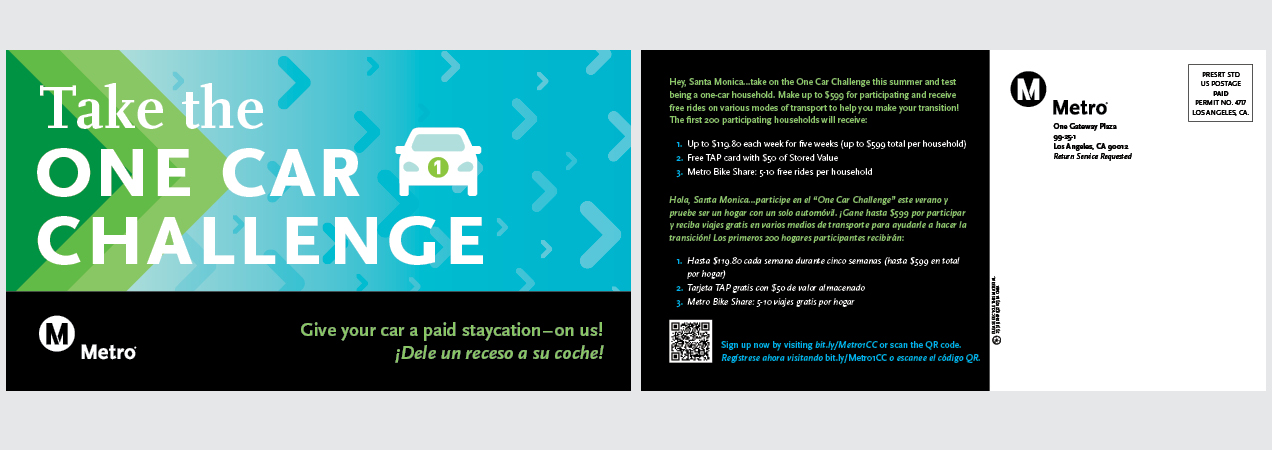 A colorful and vibrant promotion for Metro’s One Car Challenge pilot launched in Santa Monica in 2023, engaging drivers to give one household car a month-long rest in exchange for free transit and cash earnings. This program was largely promoted with print collateral and extended through earned and paid media on news outlets and social media. I designed an enticing, colorful campaign to grab the attention of transit-minded drivers to try out our pilot, and wrote the tagline “Give your car a paid staycation—on us!” This pilot engaged a group of 300 participants and learned they were 4.5 times more likely to choose transit options over driving for the duration of the program. This pilot was covered in the LA Times, Big Blue Bus and CBS News.