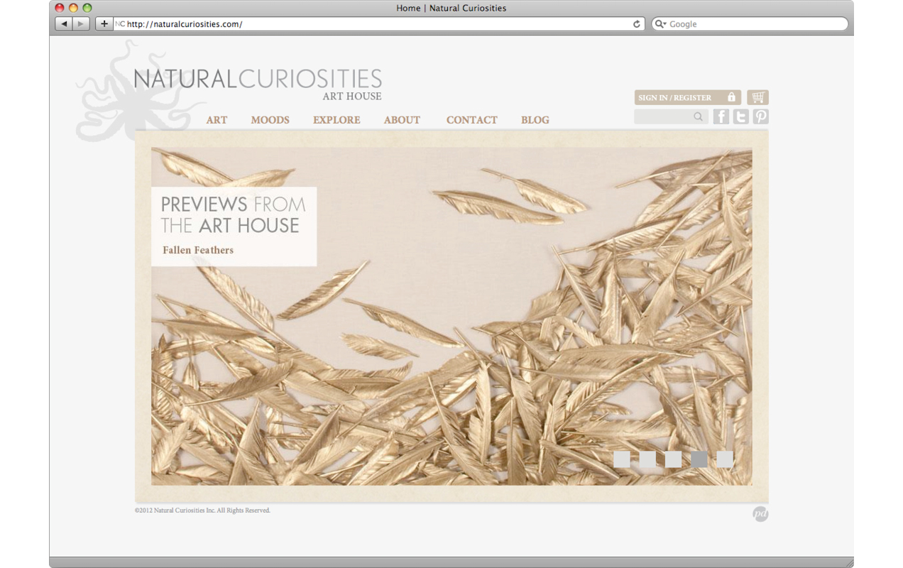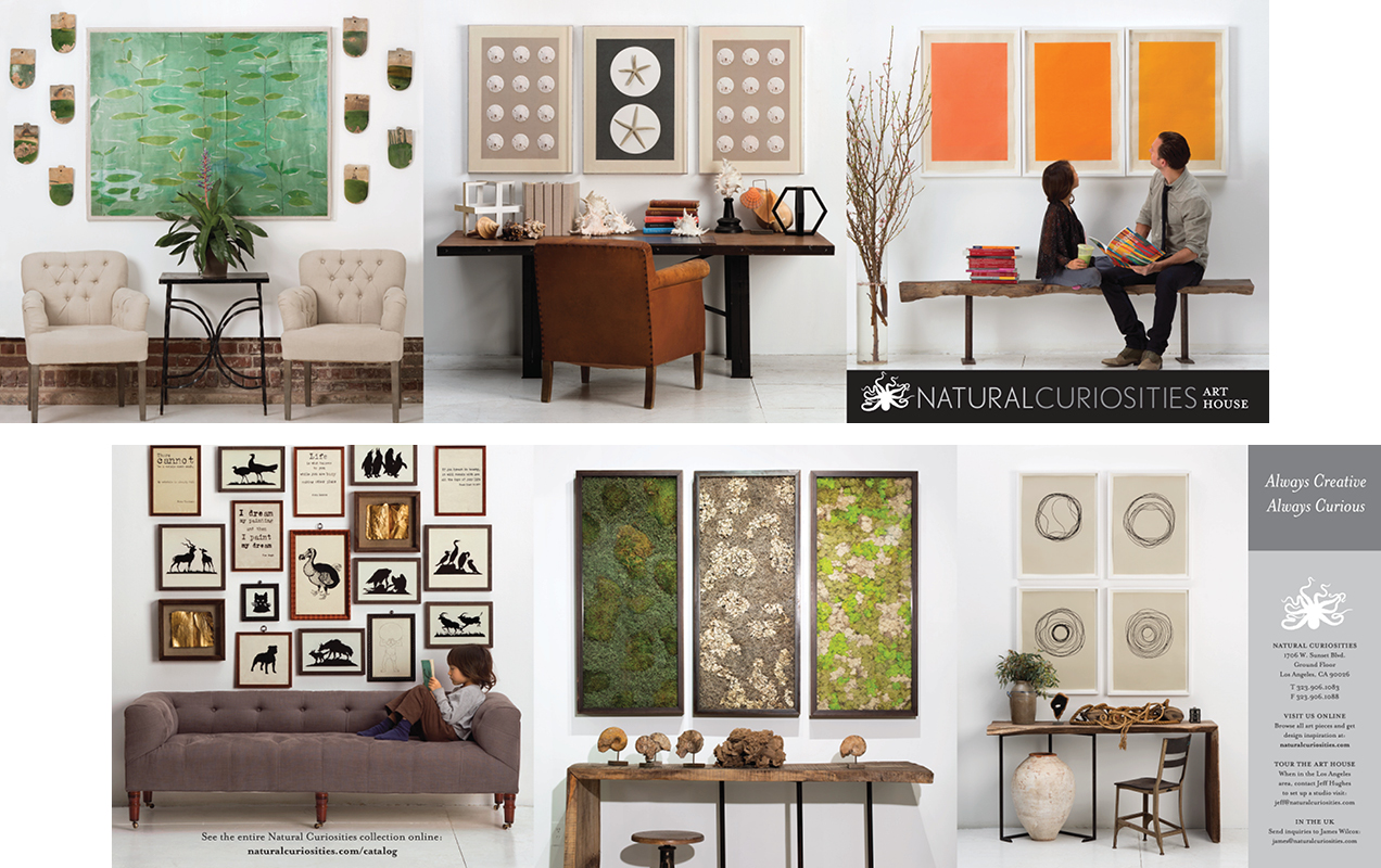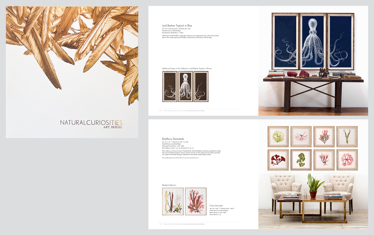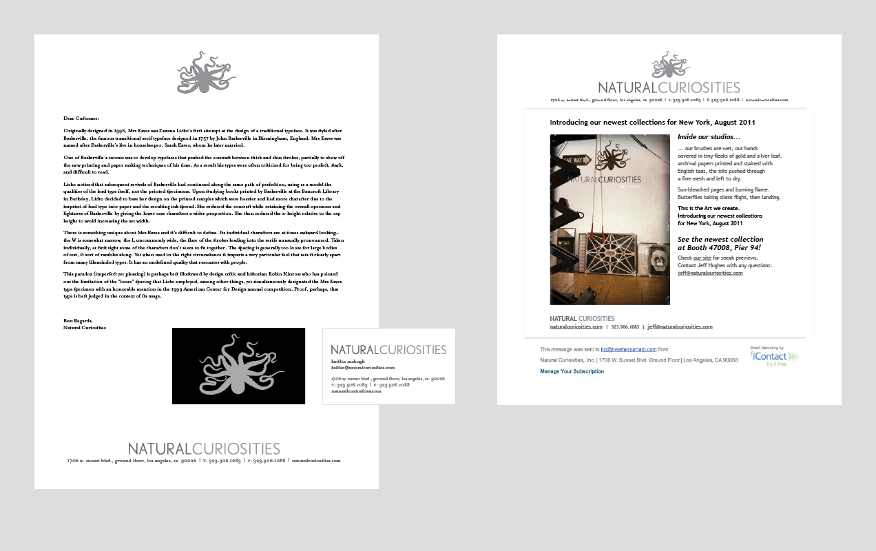 Natural Curiosities is a collective of artists under the direction of Christopher Wilcox, comprising an art house producing custom and archival pieces from their Echo Park studio. They had the logo and wordmark when we started working together, but I streamlined its colors, uses, typefaces and size ratios, and standardized how it would be used across all brand media. From there, I further cultivated the brand identity in a new iteration of their web site and showcased current collections in periodical catalogs.