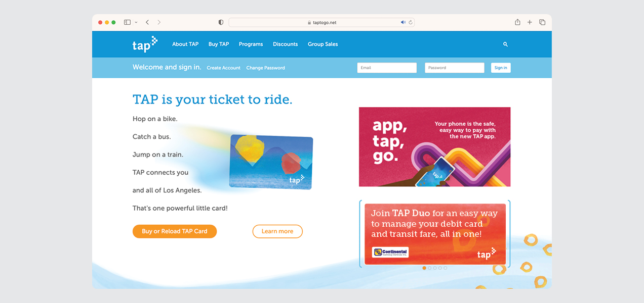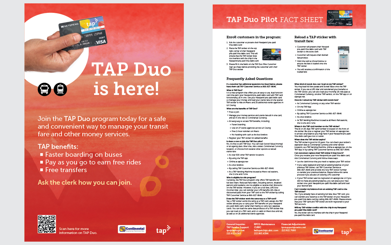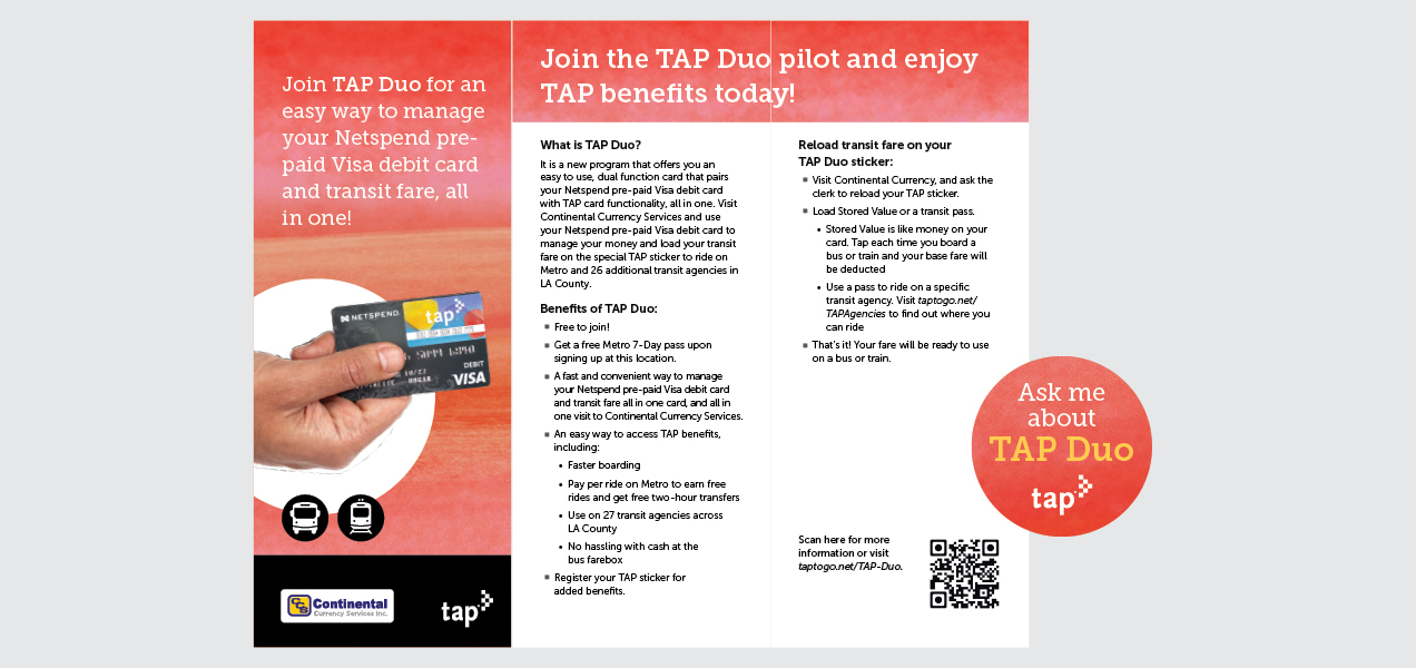 Expanding from the payment system that is typically affiliated with a fare card of a specific transit system, TAP has expanded to a TAP-enabled sticker that pairs with a debit card, rewards card or library card—with more to come! Carry all your TAP benefits with one of your other favorite cards and ride interchangeably on transit system that takes TAP. I worked within the TAP branding system to create a unique campaign to promote TAP benefits branching out to new users. This campaign spanned posters, fact sheets, take-one brochures, buttons, t-shirts and paid digital ads.