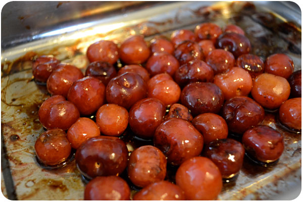 recipes suggest to roast cherries about 30 minutes at 325, in anything from just oil to a mix of sauces. i found that mine all boiled away, but if you wanted to reserve the sauce, roasting covered would be a good idea. i decided to live dangerously and wing it, adding canola oil, balsamic vinegar, red wine and vanilla extract. i roasted 42 cherries to cover the bottom of a shallow 8″ pan, but once it was done, i could see more would have been fine. also, a deeper pan would allow for more fruit.
